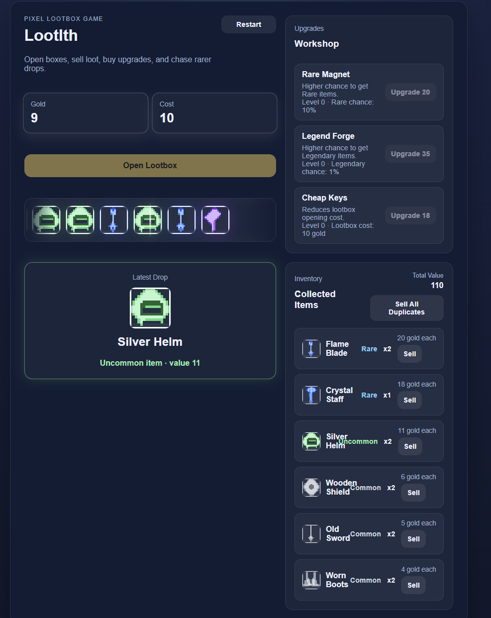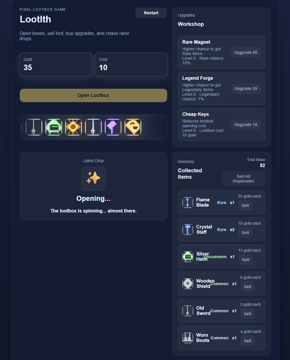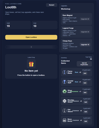 Open lootboxes, watch the reel stop on your reward, collect pixel-art loot, sell duplicates for gold, and upgrade your odds to chase rare, epic, and legendary items.